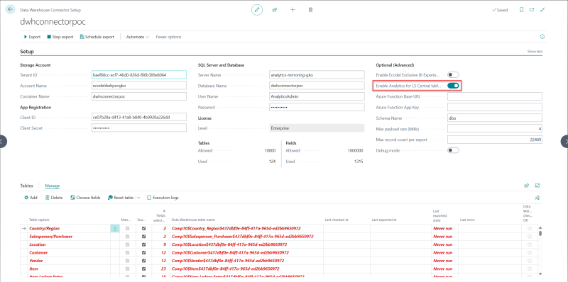 - When you have setup the app and configured the storage account, app registration and SQL server and database on the Data Warehouse Connector Setup page, as shown in the setup video, you can enable the Analytics for LS Central tables and fields by simply clicking the switch under Optional (Advanced) section in the Setup fast tab. All tables needed for standard Analytics tables will be added to the Tables list with the minimum fields selected. You can of course add more fields to the export if you want to extend Analytics, and you can also do this at a later point but then you will need to reset the table to get data for the added fields.