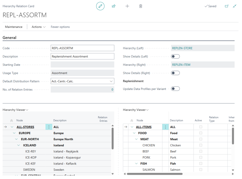 A Hierarchy Relation is the combination of two hierarchies where some of the nodes are related with each other. A commonly used Hierarchy Relation is the classical Item Assortment, where an Item-based hierarchy is combined with a Store-based hierarchy. This is done to define which Items are sold/replenished in which stores.