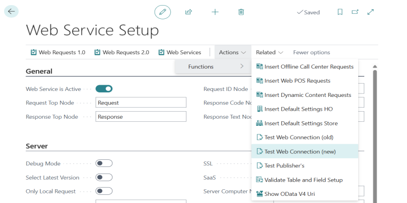 Note: You can also test the connection by selecting Actions > Functions > Test Web Connection.