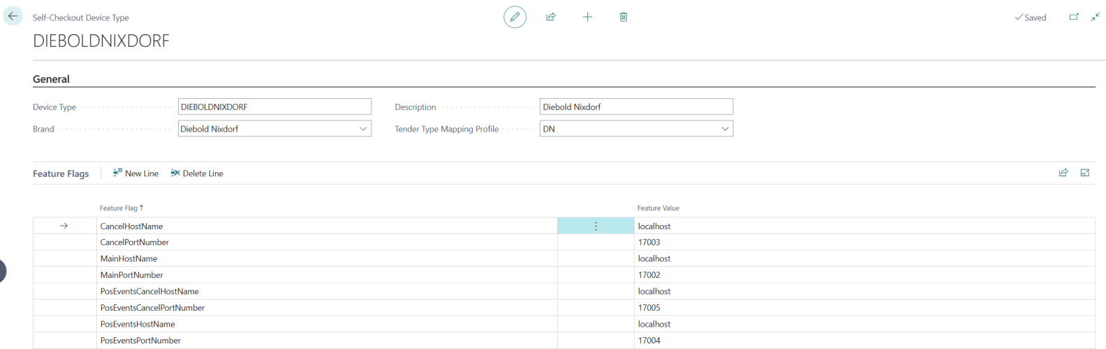 Each feature flag corresponds to a hostname and port number used by SCO to establish a connection with a specific Diebold method group. These must be configured in the Self-Checkout Device Type page in Business Central.
