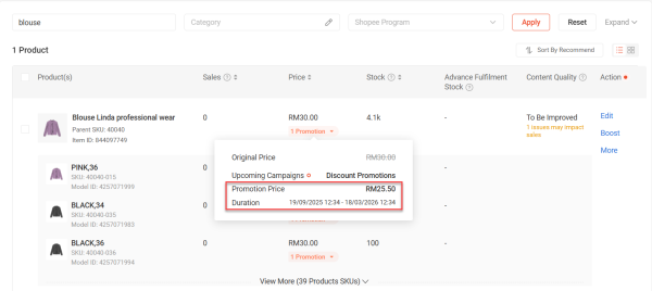 - In the Shopee Sandbox or a live Shopee seller account, verify that the discount promotion has been successfully synced and that the P1081: Blouse offer - 15% disc has been completely removed. The screenshots below show a comparison of the promotion before and after removal.