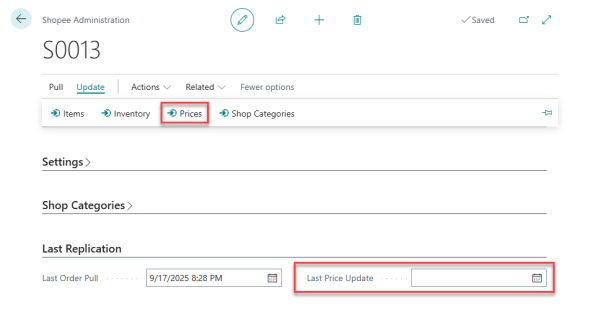 Before proceeding with the update, reset Last Replication - Last Price Update, and then click Update - Prices .