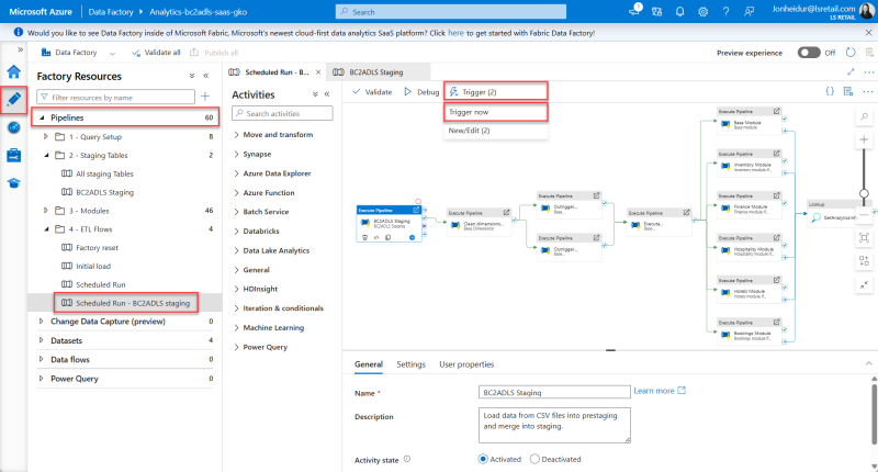 First, you need to trigger a single run of the Scheduled run - BC2ADLS staging pipeline. This pipeline triggers two other pipelines, one after the other. First, the BC2ADLS staging pipeline, which copies data from the delta files in the storage account into the prestaging tables and then triggers the merge from prestaging to staging. And then the the pipeline triggers the dimensions and fact procedure pipelines and thereby performs the initial data load of the data warehouse.