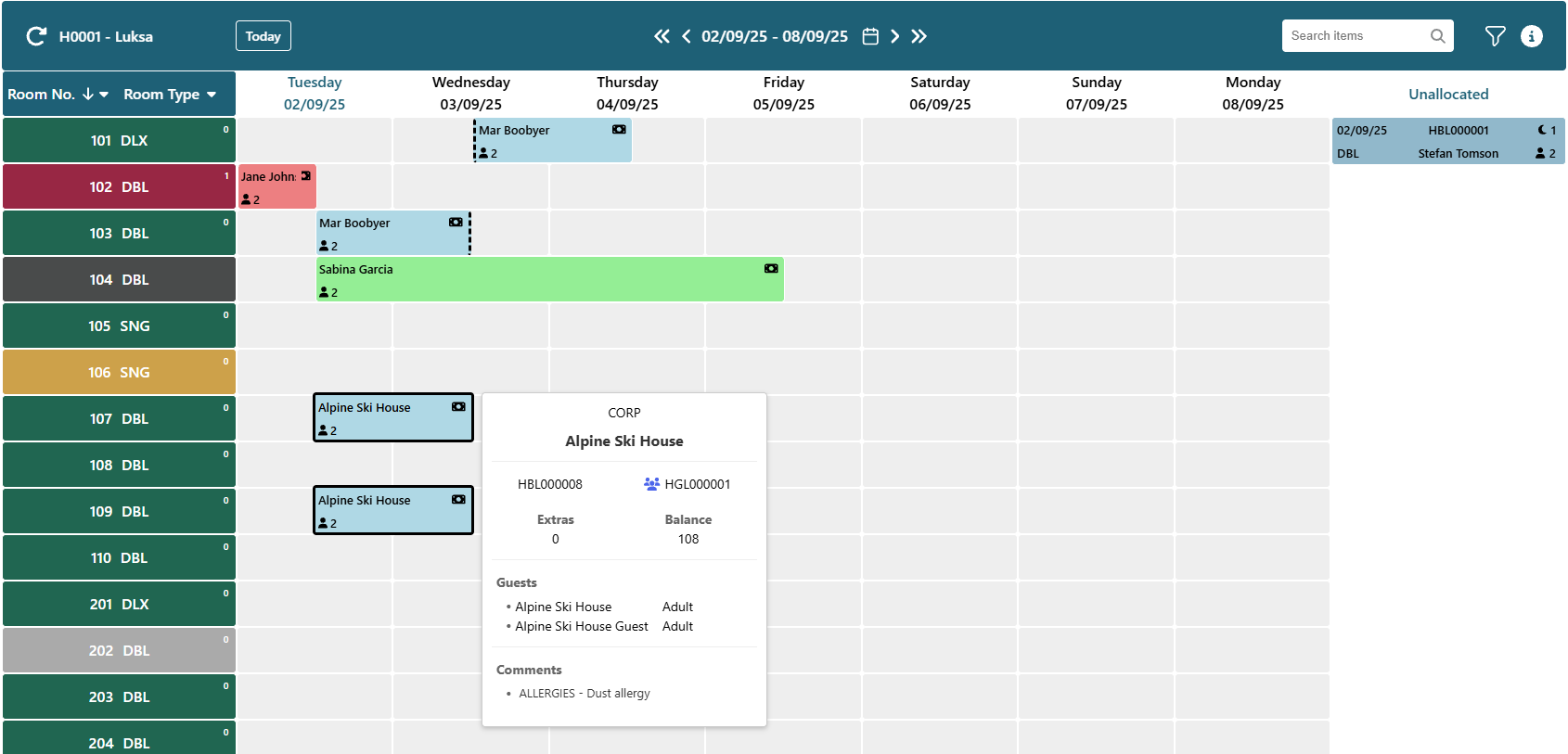 | The column on the far right | The column on the far right shows unallocated rooms. This column is not visible, unless there are reservations that have not been allocated but have arrivals on the visible dates. There are three ways to allocate a reservation to a room. You can right-click the reservation to open a context menu and select either Auto Allocate or Assign Room. If you choose Assign Room, a modal will appear allowing you to select a room. The third option is to drag and drop the reservation to the desired date and room type. If you drop the reservation on a different date or room type, a pop-up window appears where you can confirm changes in the room type and price. |