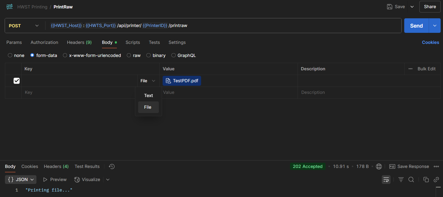 {http(s)}://{hotstname}:{port}/api/printer/{printerID}/printraw - Go to the Body tab, select form-data.