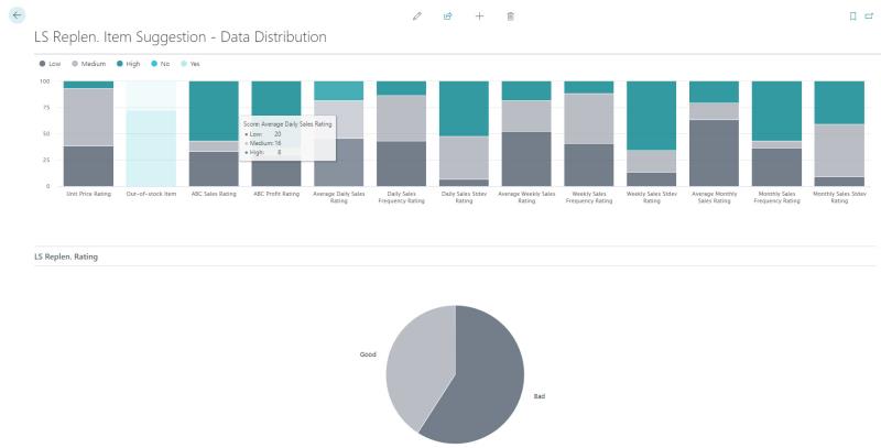 The following is an example of the Metrics Rating Distribution Chart, showing the number of items in each rating group for each metric. The pie chart shows the number of items which have been identified as good candidates for Replenishment as well as the bad candidates.