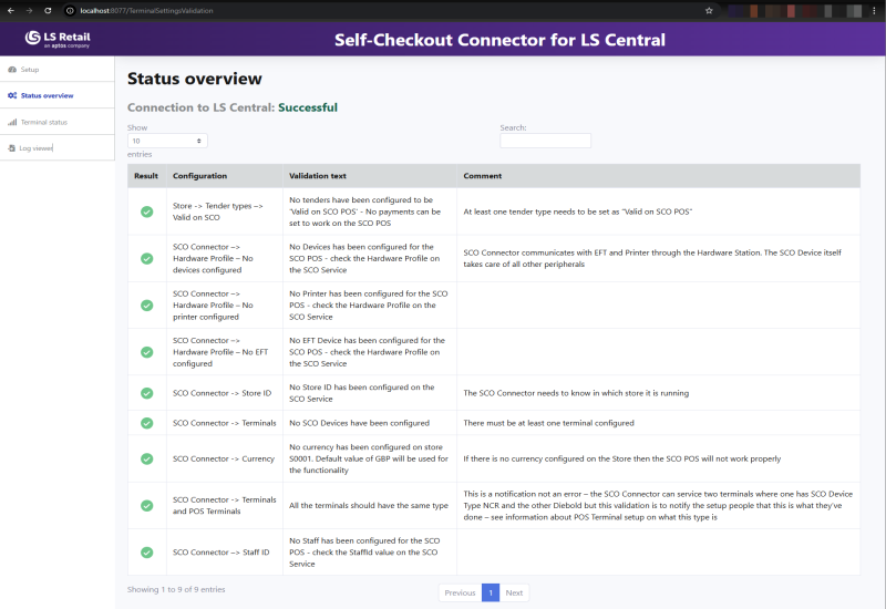 The portal validates the SCO configuration received from LS Central and reports missing or incorrect settings.
