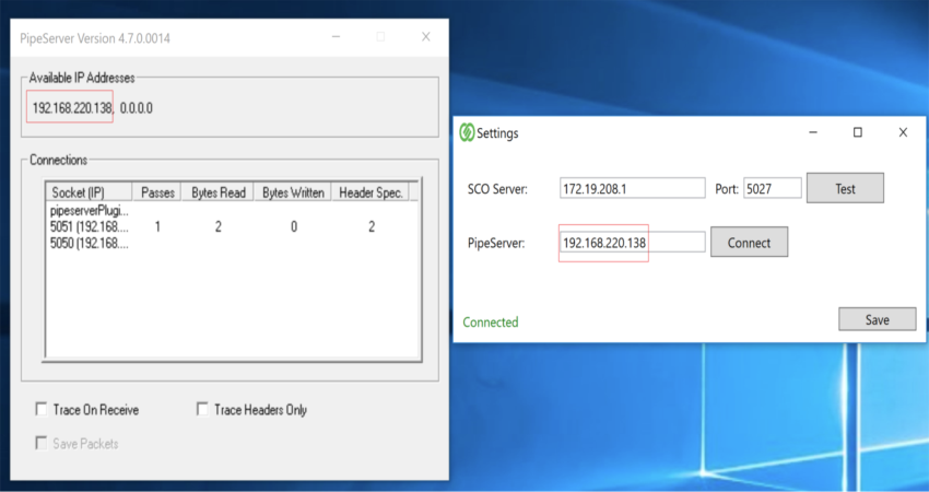 - Connect – Connects to PipeServer. A green Connected status appears in the lower-left corner when successful.