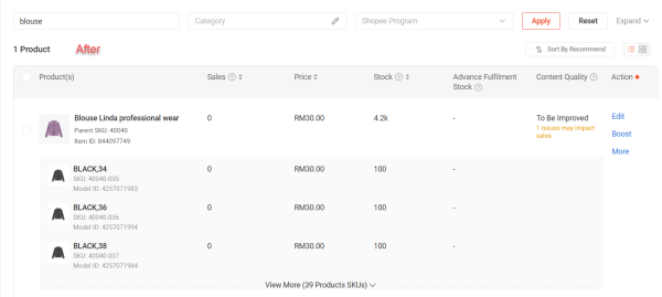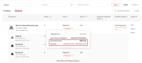 - In the Shopee Sandbox or a live Shopee seller account, verify that the discount promotion has been successfully synced and that the P1081: Blouse offer - 15% disc has been completely removed. The screenshots below show a comparison of the promotion before and after removal.