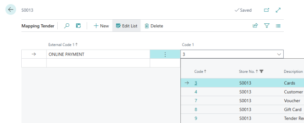 - Map the Shopee Gateway code to the External Code 1 field, and map with the LS Central Tender type code in the Code 1 field.