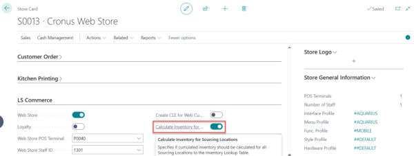 - In the LS Commerce FastTab in the Store Card, enable the Calculate Inventory for Sourcing Locations check box. First, confirm that the Warehouse (W0001) location for the Web Store exists; if it does not, create a new entry in the Customer Order Sourcing Locations table.