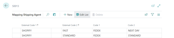 - Map the Shopify Source to the External Code 1 field and Code to External Code 2, and map with LS Central Shipping Agent Code in the Code 1 field and Shipping Agent Service Code in the Code 2 field.