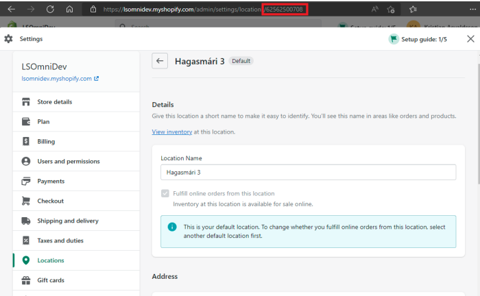 - To find the ID for the Shopify location, go into Settings - Locations.