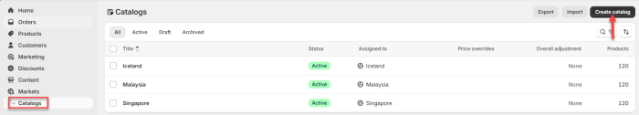 Go to Shopify Admin. Navigate to Markets and click Create Market. Then, go to Catalogs and click Create Catalog.