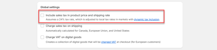 Note: If the Include Tax with Price option in Shopify Administration page is disabled, then the Include sales tax in product price and shipping rate check box in the Shopify Admin > Settings > Taxes and duties must also be unchecked (left blank). This ensures that item prices sent from LS Central are treated as tax-exclusive in Shopify, maintaining pricing accuracy.
