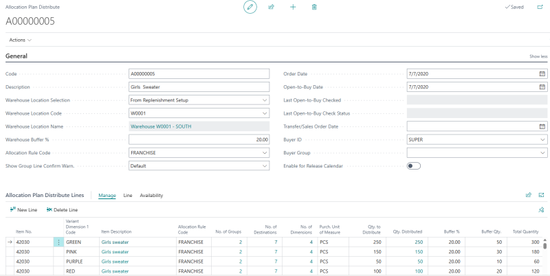 Allocation Plan assists you in the process of creating a Purchase Order to purchase the items from the vendor to the warehouse and using Transfer Order (Cross Docking) / Sales Order (Franchise) to transfer items from the warehouse to store(s), location(s), or customer(s).