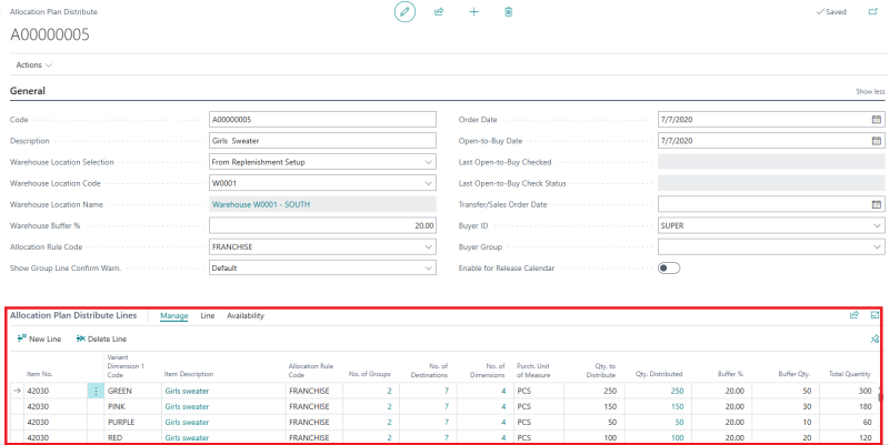 - In the Allocation Plan Distribute Lines FastTab, select an Item No. Then the Item Description, Allocation Rule Code, No. of Groups, No. of Destination, and Buffer % fields will be populated automatically.
