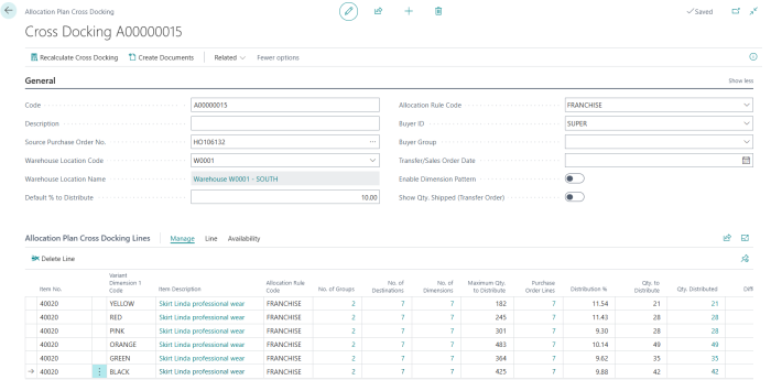 Alternatively, you can set the Dimension Pattern Qty. to Distribute field at the Allocation Plan Cross-Docking Lines level. At this level, the quantity is distributed per item and is automatically pushed down to the associated stores or store groups. Additionally, at the header level, you can set the Dimension Pattern Qty. to Distribute field under the General FastTab. This value is then applied to all lines and propagated to every store or store group in the plan.